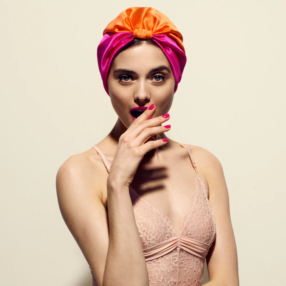 This 100% pure mulberry silk turban shields your hair against the nightly friction and moisture absorption of your pillowcase that causes breakages, dryness and frizz. Protecting your locks to promote growth, boost shine and preserve your hairstyle day after day… all while you sleep.