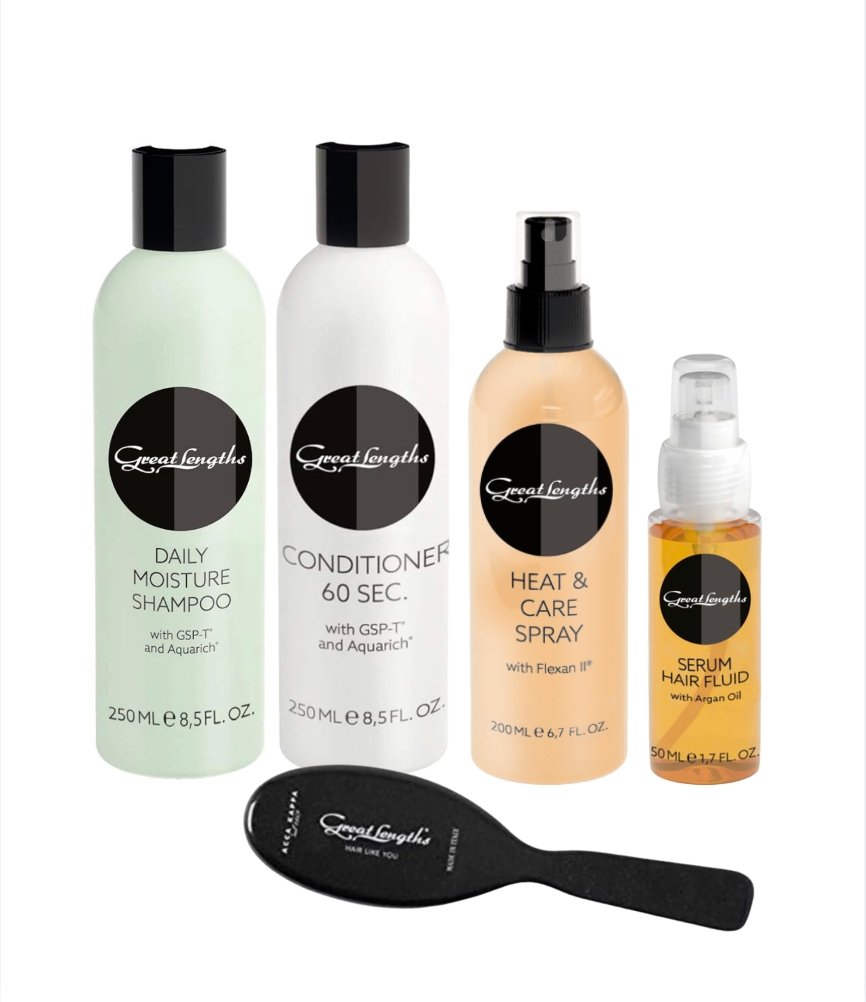 A beautiful moisture rich shampoo & conditioner. Start by cleansing the hair twice in the Great Lengths Shampoo using gentle massage motions on the scalp, ensuring to never rub the hair as this will cause unnecessary tatting. Secondly, squeeze the excess water from your hair and apply a small amount of the Great Lengths Conditioner to the mid-lengths and ends, avoiding the root area, thoroughly rinse ensuring no product is left in the hair. Use your Great Lengths Extension brush to brush through all types of hair extensions from root to tip, ensuring roots stay tangle free. We advise brushing hair roots to tip at least twice per day. Gently mist over your Great Lengths Heat & Care spray to protect your hair from the harsh heat of your styling tools and blow dryer while simultaneously adding moisture and shine. Finish off with Great Lengths Serum, a light hair serum for softness and shine filled with the goodness of Argan oil and Tiger Nut Oil. Suitable for all hair types.